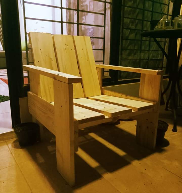 Bahan utama kursi ini adalah kayu papan bekas palet.